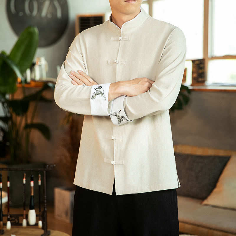 Koszula męska z długim rękawem z bawełny Buddha Stones Tang Suit z żabą i guzikami Crane - Beżowy - US/UK/AU46, EU56 (5XL) - image 8