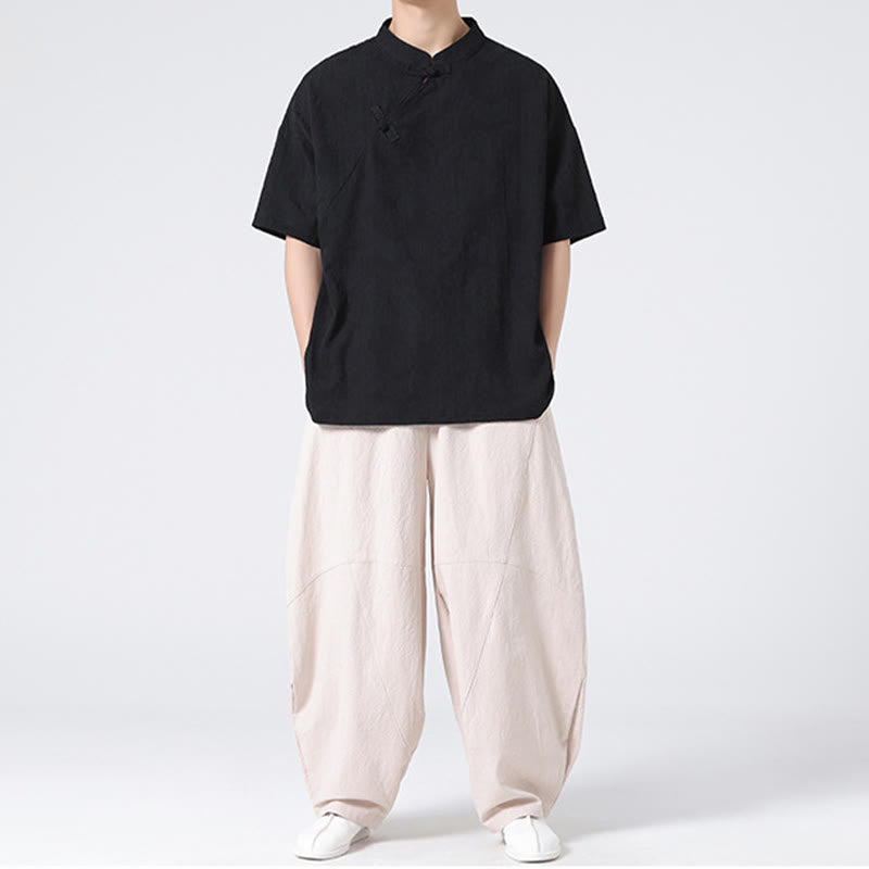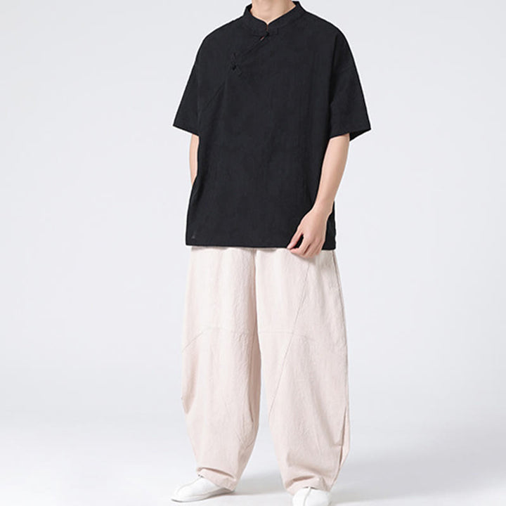 Koszula męska z krótkim rękawem z bawełny i lnu w stylu retro z motywem żaby i kwiatowym wzorem w kwiaty Buddha Stones Retro Pure Color - image 33
