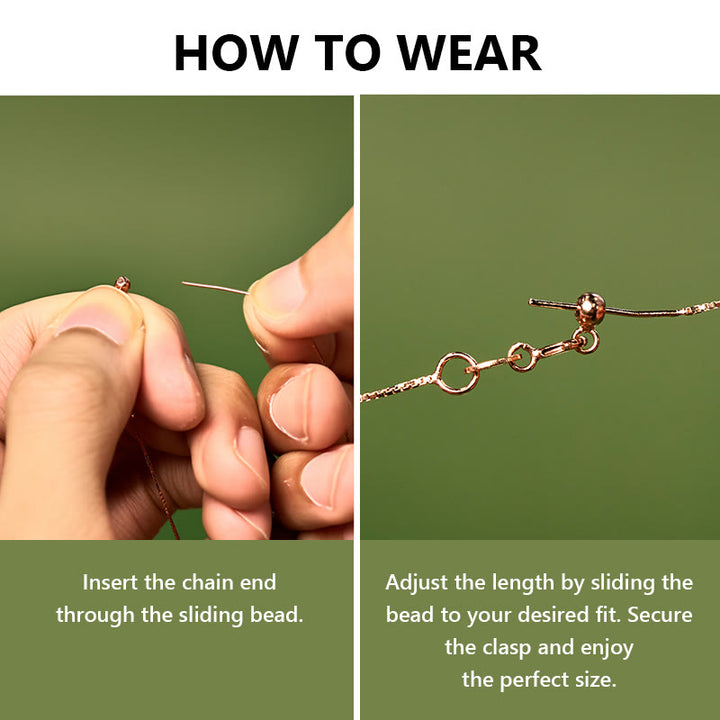 Przytrzymaj koralik suwaka jedną ręką i delikatnie pociągnij końce łańcuszka drugą ręką, aby zacisnąć lub poluzować bransoletkę/naszyjnik.