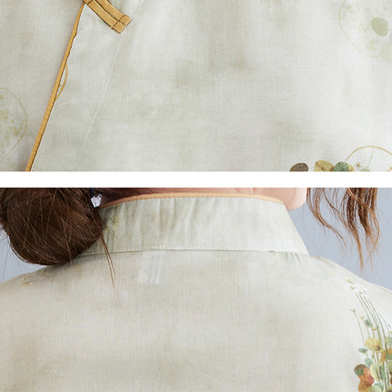 Cheongsam z nadrukiem Flowers Green Yellow Leaves charakteryzuje się pięknym kwiatowym wzorem symbolizującym wzrost i witalność . Ta sukienka ma rękawy trzy czwarte i wygodne kieszenie, dzięki czemu idealnie nadaje się do medytacji i praktyk duchowych. Elegancki design i żywe kolory inspirują poczucie spokoju i harmonii, odzwierciedlając naturalne piękno kwiatów i liści. 💕