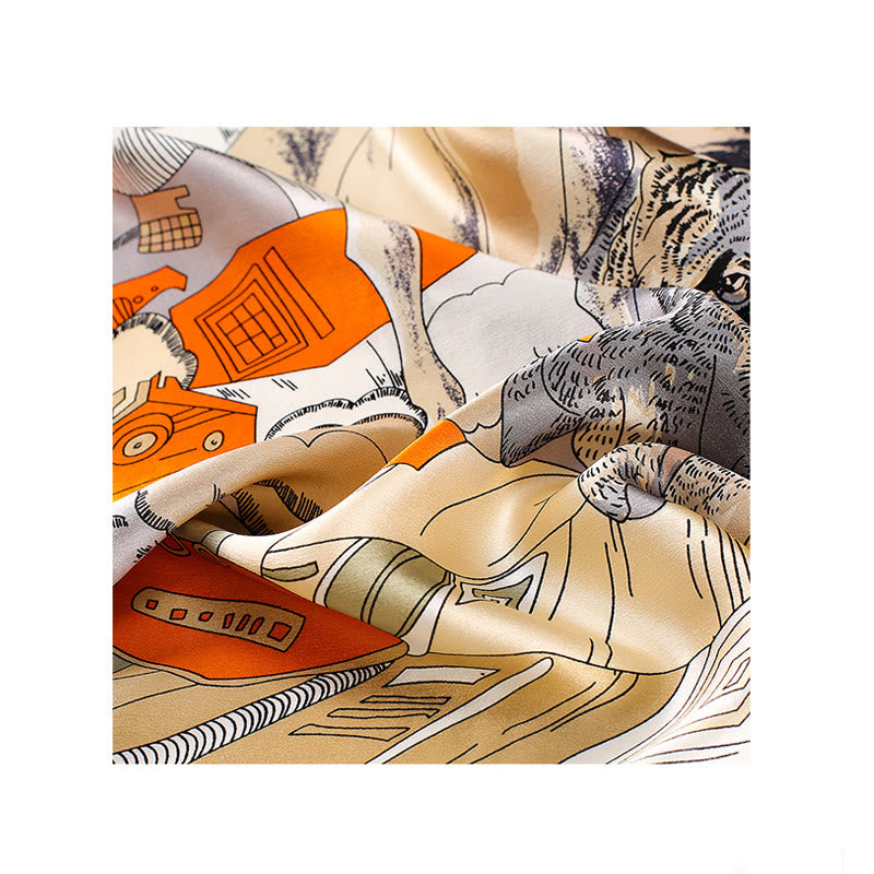 Inspiracją do projektu są obrazy olejne, śnieżne sceny miasta, niebieski lotos w starożytnym zamku, podróże żeglarskie, świat zwierząt. Odważne dopasowanie kolorów sprawia, że kolor jedwabnego szalika jest bardziej jaskrawy, nadając Ci niepowtarzalny urok.