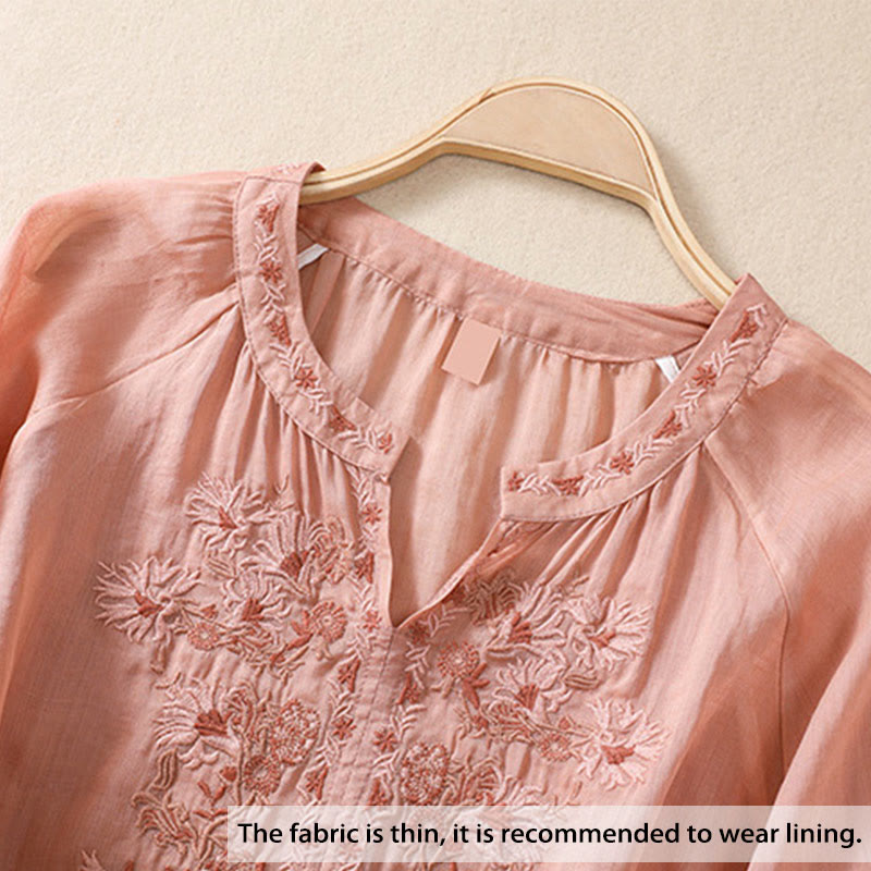 Koszula Buddha Stones z bawełny i lnu z haftem i rękawami trzy czwarte