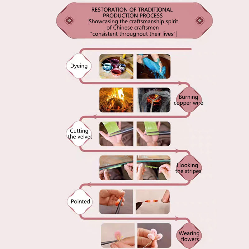 - Rzemiosło artystyczne : Wykonana przy użyciu tradycyjnych technik kwiatów aksamitnych, ta broszka prezentuje misterne rzemiosło przekazywane z pokolenia na pokolenie. Użycie jedwabiu jako podstawowego materiału podkreśla delikatną i luksusową naturę tej formy sztuki.