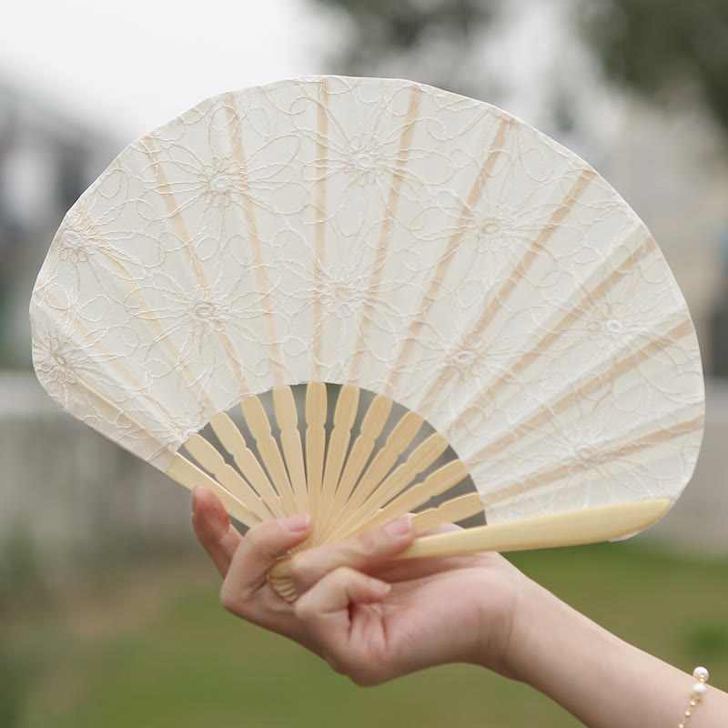 Buddha Stones Retro Duży Kwiat Haft Muszla Kształt Chwostów Ręczny Składany Wachlarz Bambusowy