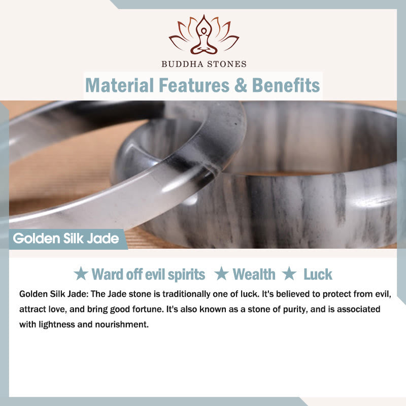 Złoty jedwabny jadeit: Jadeit jest tradycyjnie kamieniem szczęścia. Uważa się, że chroni przed złem, przyciąga miłość i przynosi szczęście. Jest również znany jako kamień czystości i jest kojarzony z lekkością i odżywieniem.