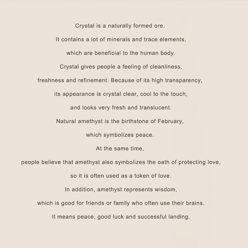 - Uwaga: Ze względu na naturę ametystu, ten element może mieć niewielkie różnice w kolorze, szczegółach i ogólnym wyglądzie. Takie cechy podkreślają wyjątkowe piękno każdego elementu.