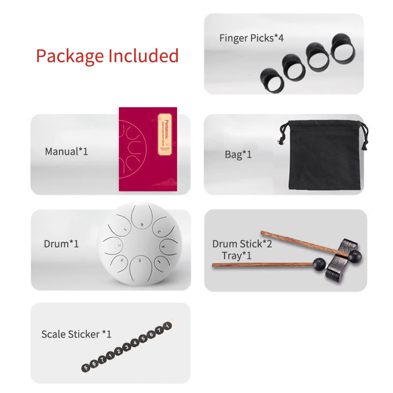 - Opakowanie: Instrukcja*1, Naklejka na skalę*1, Pałeczki perkusyjne*2, Tacka*1, Torba*1, Bęben*1, Kostki do gry na palcach*4