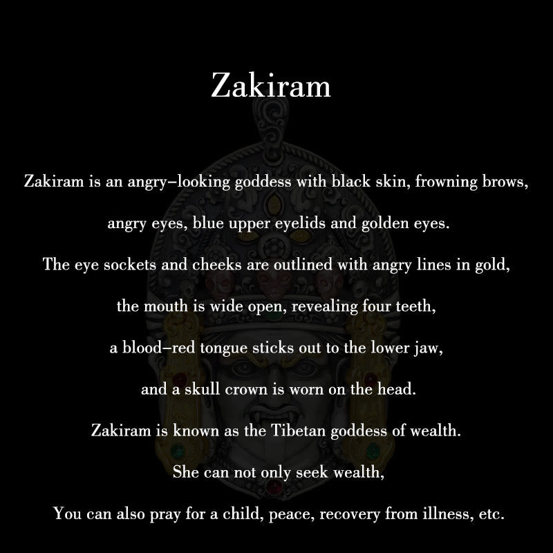 Noszenie wisiorka Zakiram jest popularne wśród kobiet tybetańskich. Wierzą, że bogini reprezentuje bogactwo, ochronę rodziny, bezpieczeństwo, zdrowie i gładkość życia.