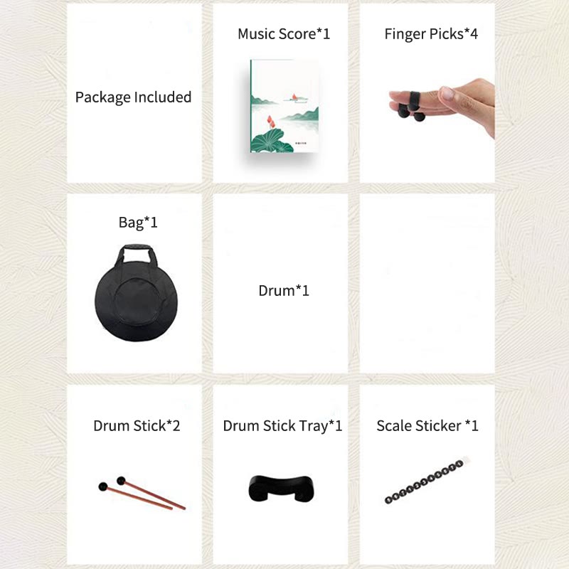 - Opakowanie: Instrukcja*1, Naklejka na skalę*1, Pałeczki perkusyjne*2, Tacka*1, Torba*1, Bęben*1, Kostki do gry na palcach*4