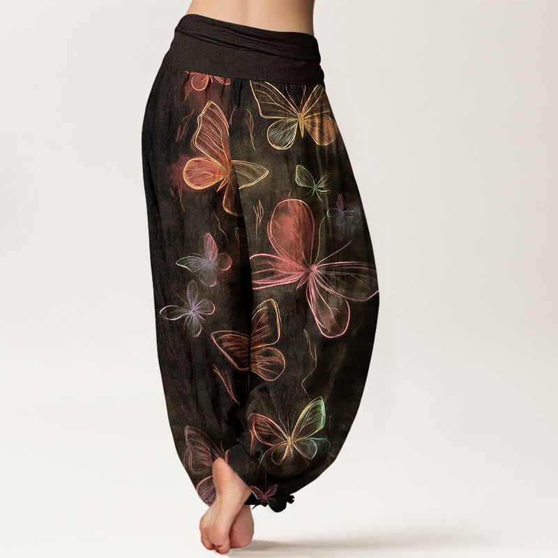 - Wzór : Te spodnie haremowe zdobi motyw motyla, symbolizujący transformację. Misterne linie przedstawiają kształt motyla i wzory na jego skrzydłach, które wydają się półprzezroczyste, co nadaje lekkości i zwinności. Motyle przedstawione są w różnych pozach, co tworzy dynamiczne wrażenie lotu. Wzór jest zarówno głęboko znaczący, jak i estetyczny.